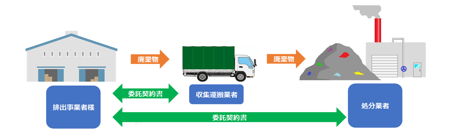 産業廃棄物の排出事業者は、産業廃棄物の処理を産業廃棄物処理業者に委託する場合には、「排出事業者と産業廃棄物収集運搬業者」・「排出事業者と産業廃棄物処分業者」との二者間契約で委託契約を締結しなければならないと法令で定められております。